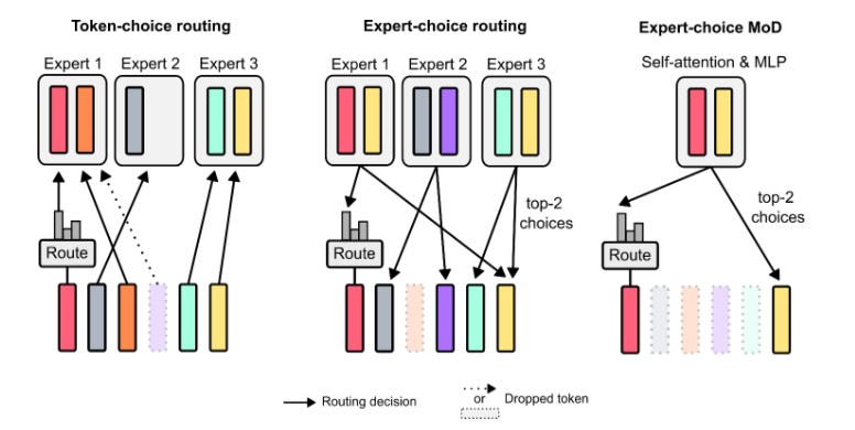 Two main routing schemes are discussed: token-choice and expert-choice. In token-choice routing, a router generates per-token probability distributions across computational paths, and tokens are routed to the path with the highest probability. However, this can lead to load balancing issues, as there's no guarantee that tokens will distribute evenly across paths. Expert-choice routing addresses this by having each path select the top-k tokens based on their preferences, ensuring a balanced load. This scheme is particularly suited for scenarios where one computational path is essentially a no-op (no operation), ensuring that important tokens are routed away from this path. Now the question is how are these routing scores computed? The router weight for a token is calculated using a linear projection of its embedding. Based on these weights, a certain percentile of tokens, determined by the user-defined capacity, is selected for processing in the transformer block. The output for each token is then updated based on whether its router weight is above or below this threshold.